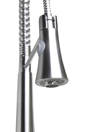 • Commercial-style kitchen faucet with spring + arm to hold the head which can be pulled down to wash large areas.